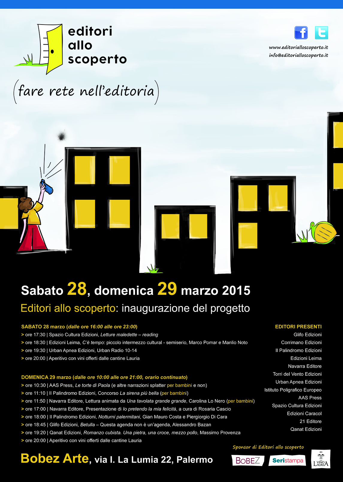 L’inaugurazione del progetto è affidata a un evento collettivo che vede la partecipazione di 13 delle 14 case editrici palermitane di Editori allo scoperto, e che avrà sede presso Bobez Arte. Il mondo del libro incontra il mondo dell’arte: l’affascinante location che ospiterà i 13 editori è, infatti, una galleria d’arte che unisce spazi espositivi e atelier di giovani artisti.